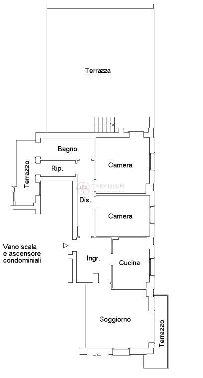 Composizione interna: ingresso, cucina separata, soggiorno, corridoio, due camere da letto, bagno, lavanderia.