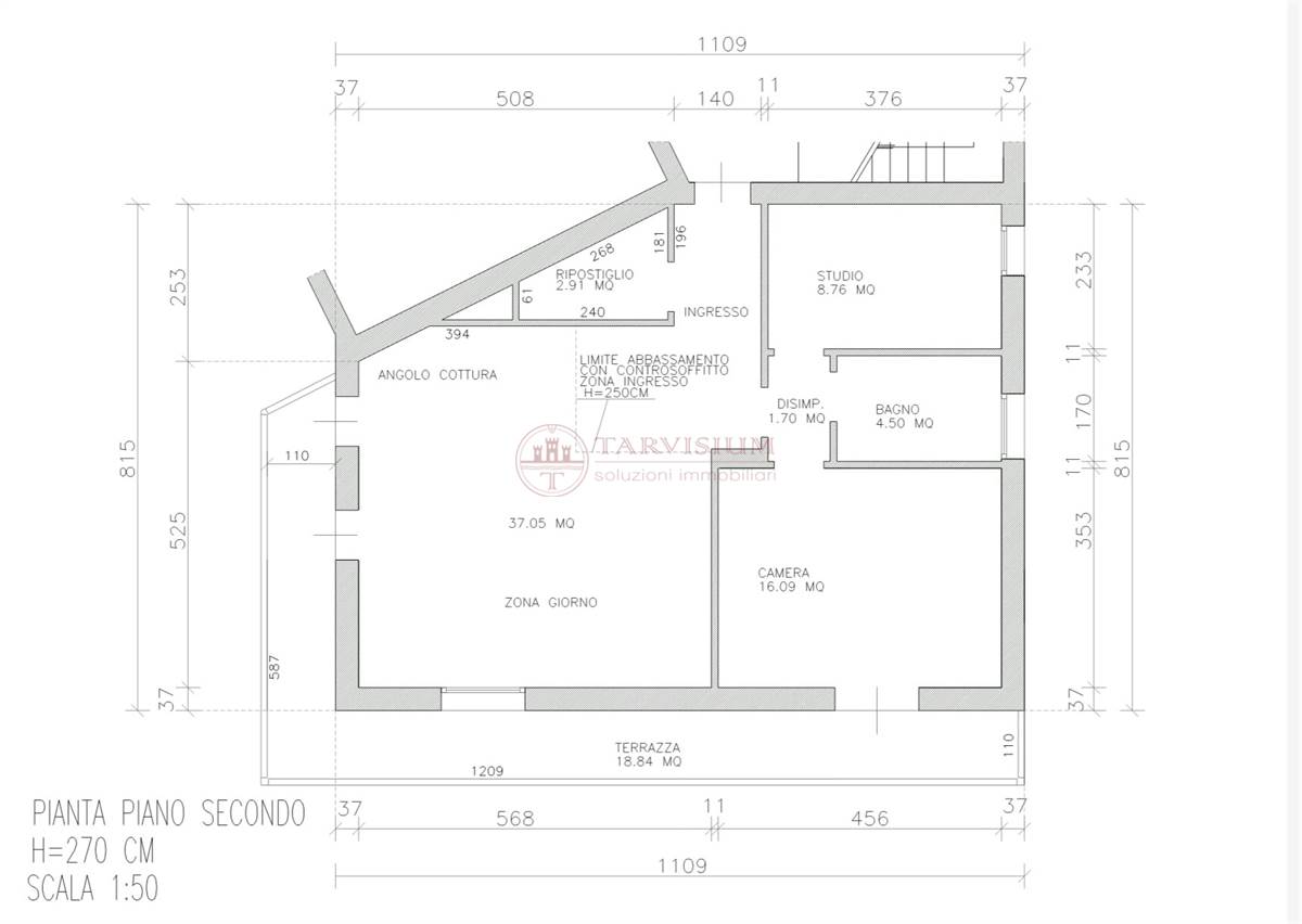 da open space di 37mq con con cucina a vista e doppia uscita sul terrazzo. Dal disimpegno si accede alla zona notte che ospita una grande camera matrimoniale con porta finestra sul terrazzo, bagno finestrato e cameretta/studio.