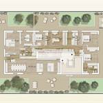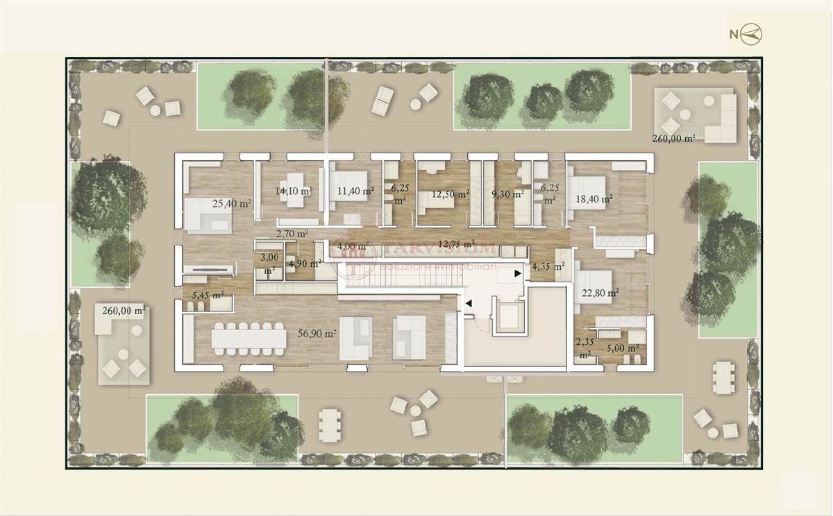 All'esterno dell'edificio si viene accolti da un'ampia zona verde - le cui diverse essenze fungeranno da filtro e limite dell'immobile - e a seguire da una profonda e distintiva loggia, su cui si apre il portone d'ingresso.