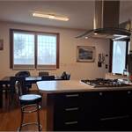 La cucina, arredata con penisola, dialoga naturalmente con la zona pranzo e offre un accesso diretto a un secondo portico, questa volta esposto a nord: uno spazio ideale per pranzi all’aperto durante la bella stagione.